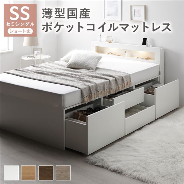 照明 宮付 チェスト ベッド ショート丈セミシングル ホワイト 薄型国産
