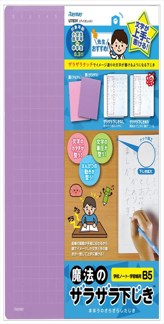 商品価格:1324円 レビュー件数:0 レビュー平均:0 店舗名: URCジャンルID: 401707< 購入ページを表示> [商品名称]レイメイ藤井 下敷き 魔法のザラザラ下じき B5 0.3mmドット バイオレット U783V[商品説明]スタイル:0.3mmドット◆商品名:レイメイ藤井 下敷き 魔法のザラザラ下じき B5 0.3mmドット バイオレット U783V先生と共同開発。ザラザラタッチでイメージ通りの文字が書ける魔法の下敷。【ザラザラ面】国語や書写などしっかり丁寧に書く学習に最適【ツルツル面】算数のひっ算など急いで書く必要のある学習に最適【カラー】バイオレット 【サイズ】B5(幅182mm×高さ257mm×奥行0.6mm)【仕様】表:ザラザラ、裏:ツルツル説明【ザラザラタッチでイメージ通りの文字が書ける】下じき表面に施した細かいドット加工が、筆記時に、鉛筆の動きが振動となってザラザラと手や指に伝わることで頭の中にイメージした文字と手の動きが一致しやすくなります。表側のザラザラ面は、国語や書写などのしっかり丁寧に書く学習に最適です。裏側のツルツル面は、算数のひっ算など、急いで書く必要のある学習に最適です。プリントや横長変形の漢字・計算ドリルに合ったA4サイズと、授業ノート・漢字練習帳などに合ったB5サイズの2サイズ展開。商品名:レイメイ藤井 下敷き 魔法のザラザラ下じき B5 0.3mmドット バイオレット U783V < 購入ページを表示>