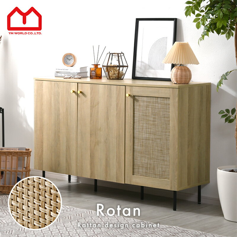 ラタン調 キャビネットおしゃれ 可動棚 大容量 収納 幅120cm 扉付